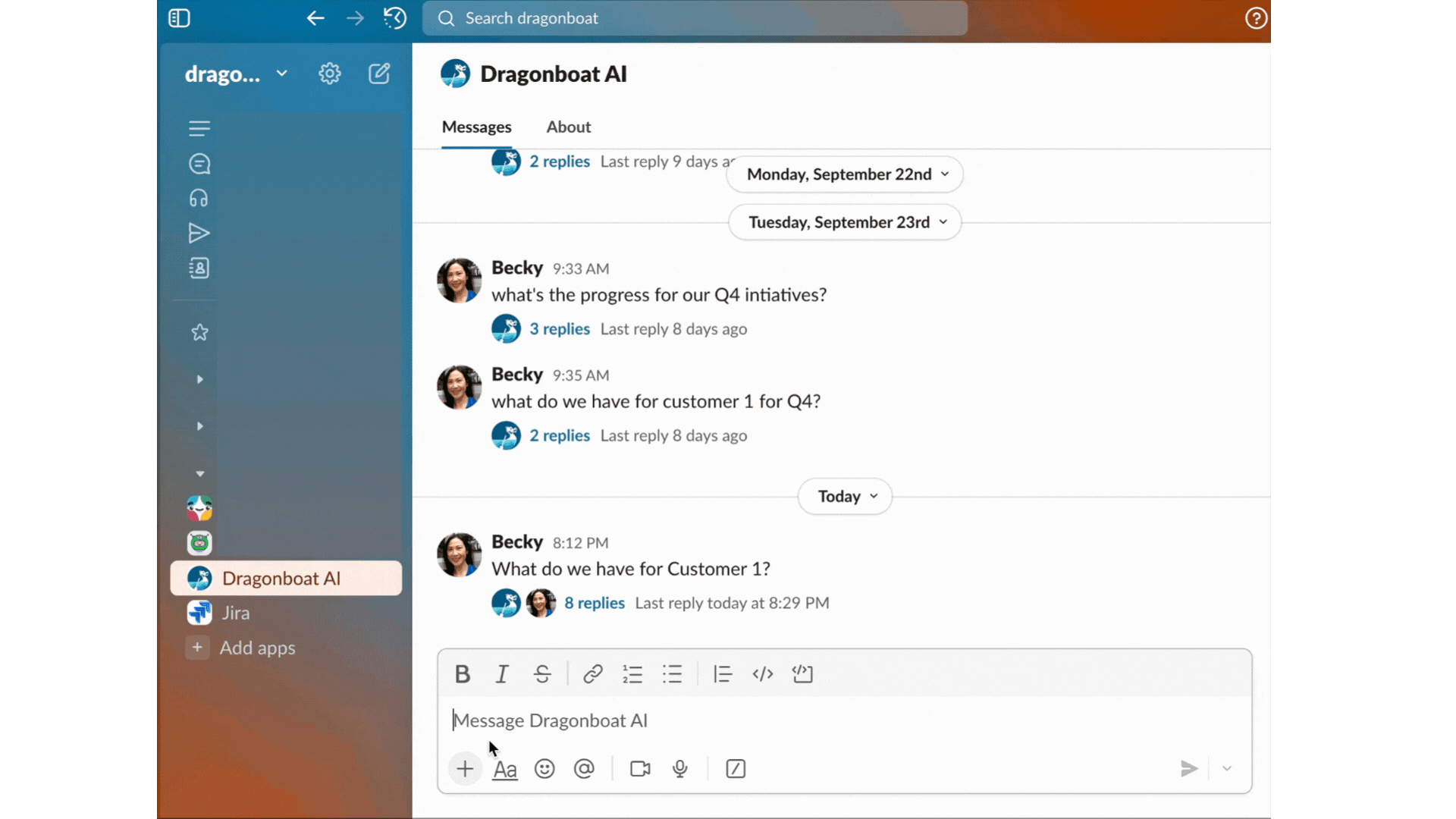 The best way to organize, prioritize, and communicate your product plan. With Dragonboat, you can easily capture feedback and requests, prioritize features and initiatives, and visualize roadmaps. Use Dragonboat’s Integration for Slack to centralize product insights and simplify the feedback input process across multiple customer touchpoints.